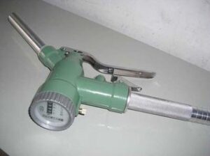 加油机油枪的开关把上设有挡片,油枪借助限位板可以将开关置与三个不同的挡位上,使主阀置于相应的三种开度来达到不同的流量。